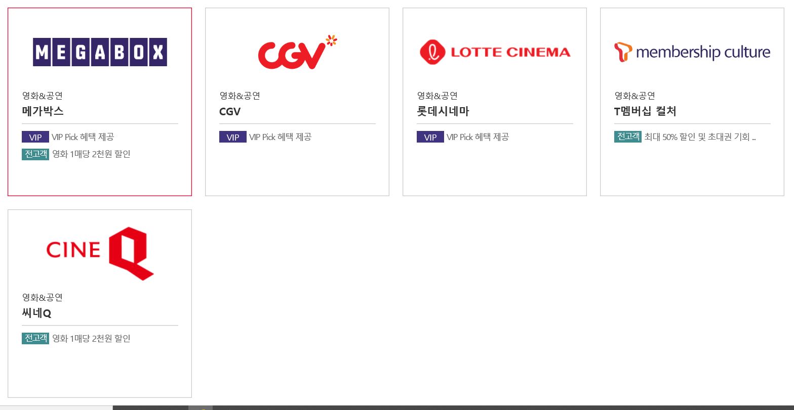 - VIP Pick은 매달 1개의 제휴사 혜택만 이용하실 수 있으며,다른 제휴사 혜택을 이용한 달에는 메가박스 혜택을 이용할 수 없음
