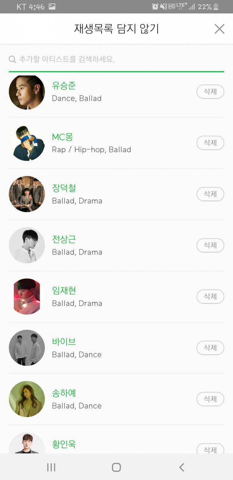 원하지 않는 가수를 추가하여 재생목록에 추가되지 않게 걸러줍니다.