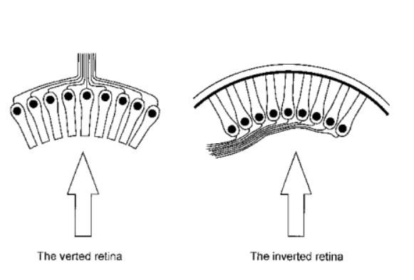 오징어는 빛을 감지하는 기관이 외부에 드러나있지만, 인간은 망막쪽 그러니까 정반대를 향하고 있음.