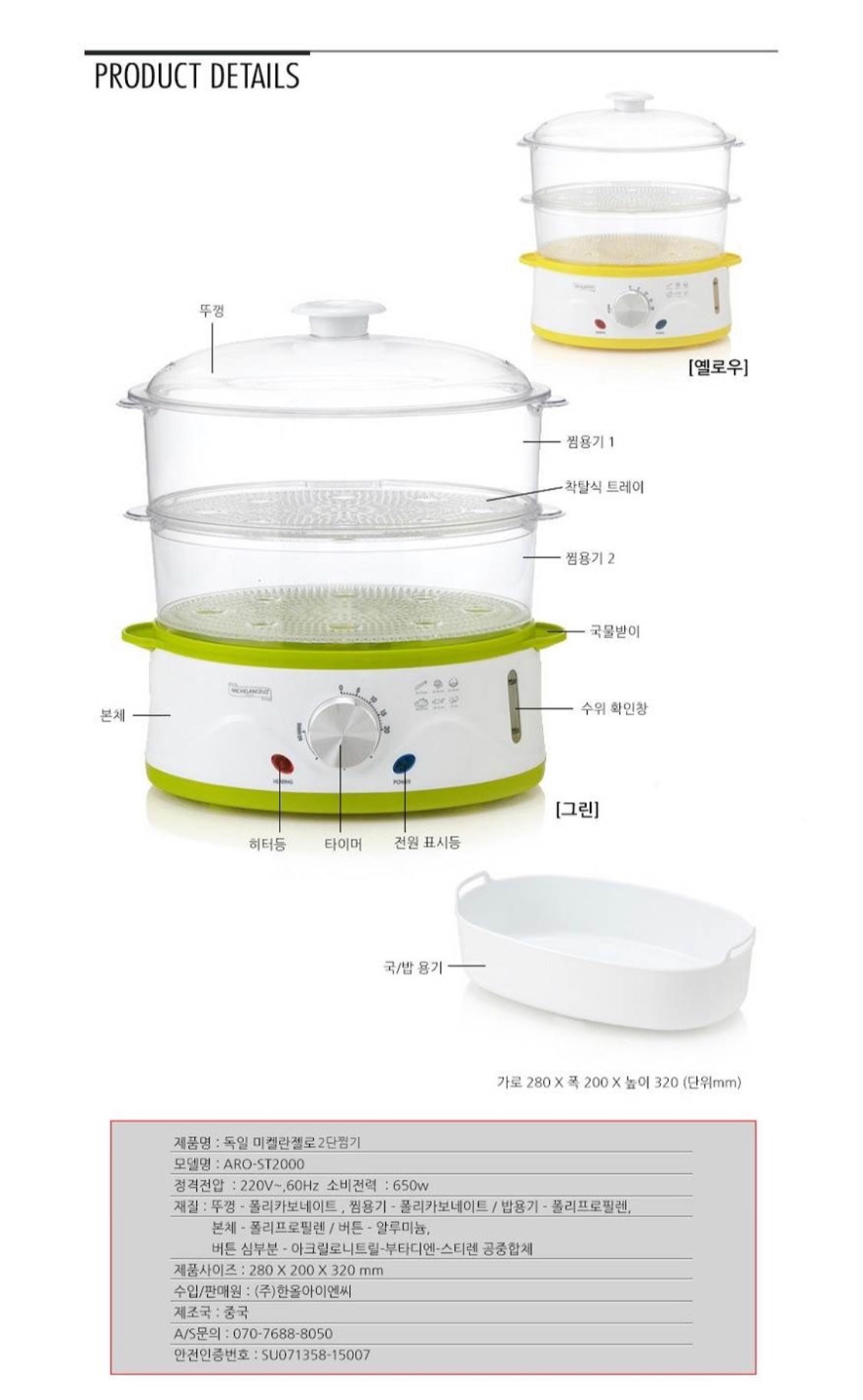 독일 미켈란젤로 2단찜기 ARO-ST2000Y(옐로우)