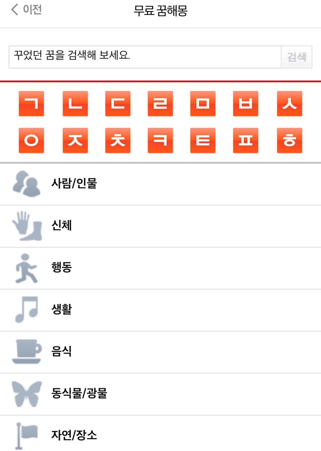 사람 관련 꿈, 신체 관련꿈, 행동에 관한 꿈,생활 관련꿈, 동식물 등등