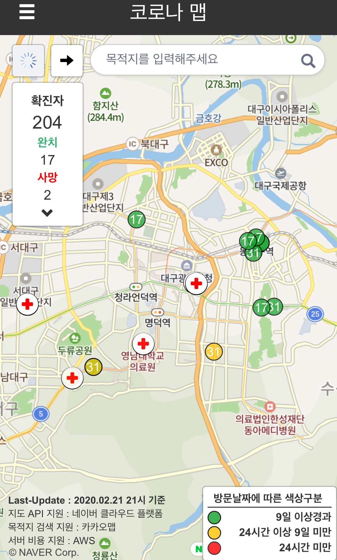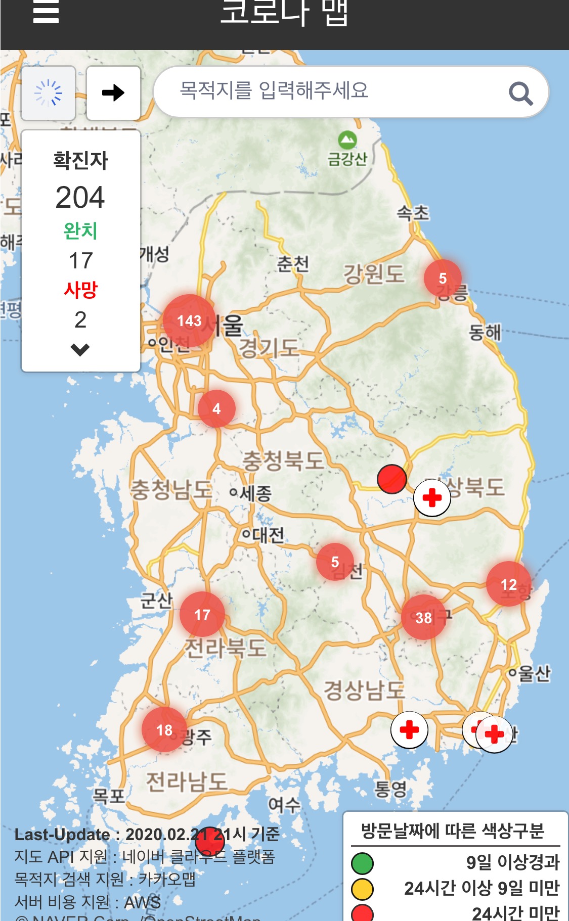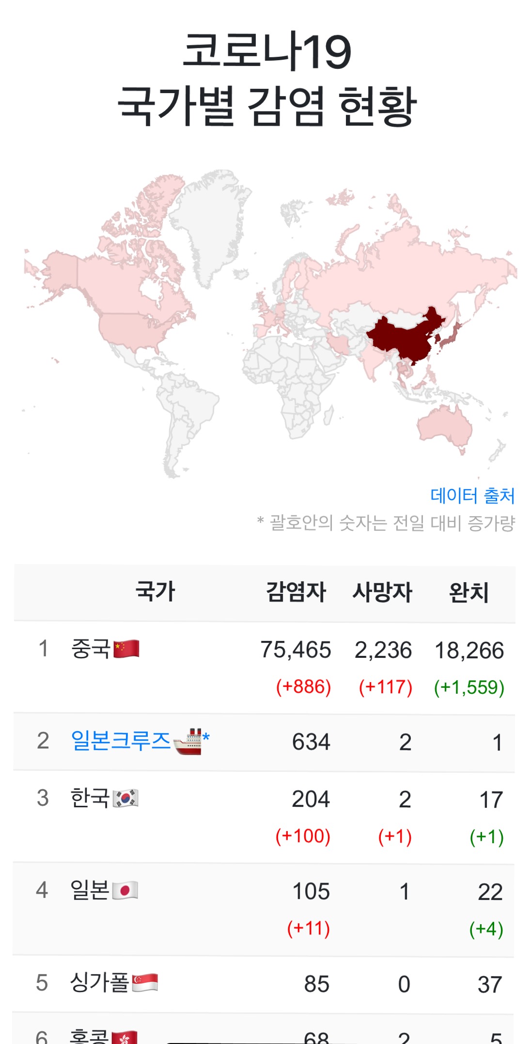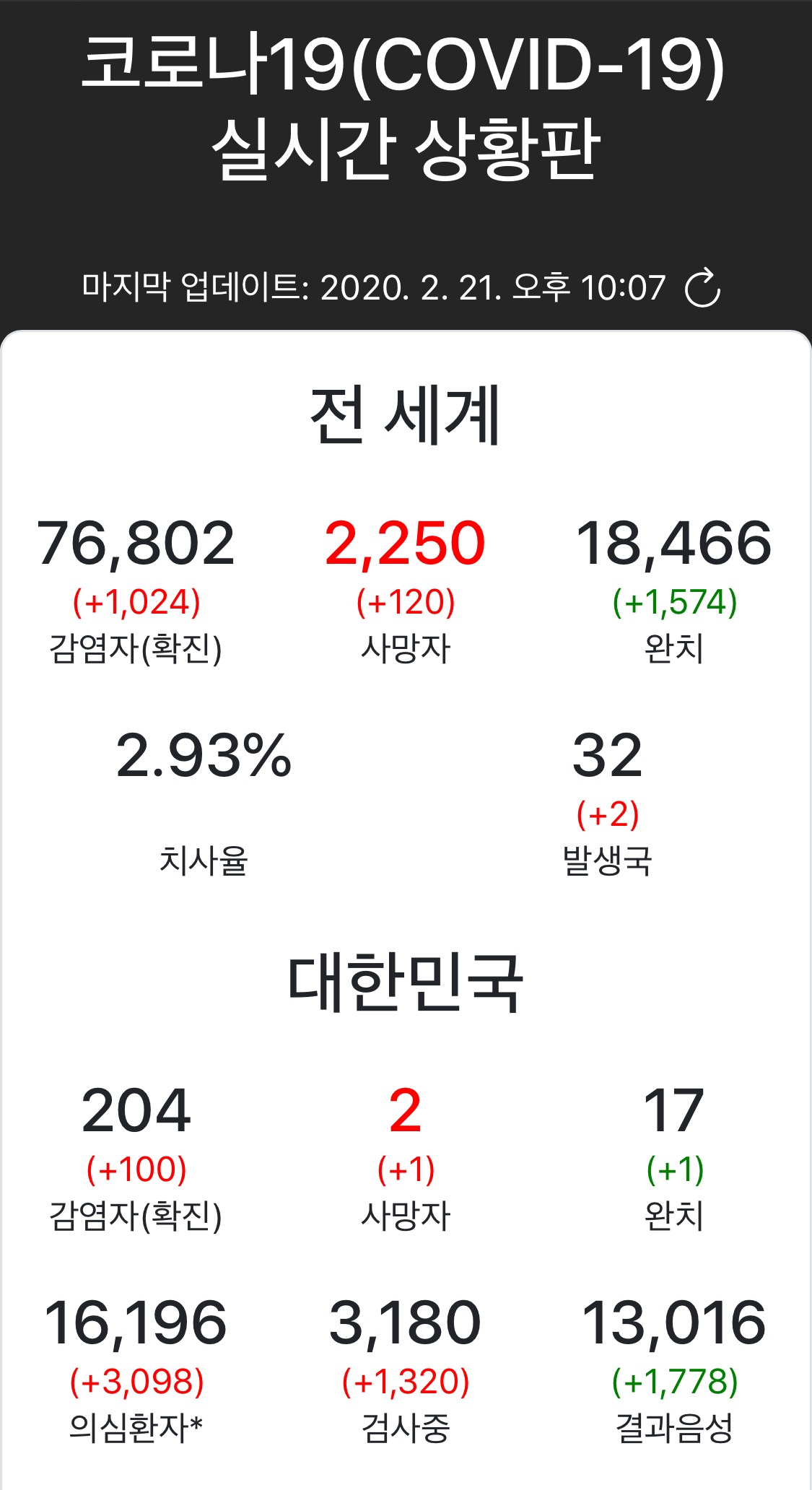 코로나19(신종 코로나바이러스)에 관한 한국, 중국 및 세계 각 국가들의 통계 및 뉴스 등을 취합하여 실시간 정보를 제공합니다.
