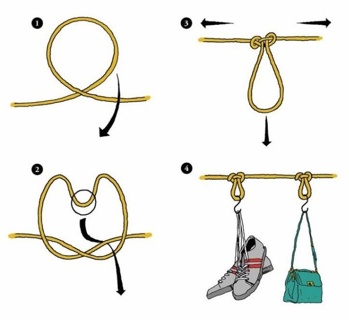줄의 중간에 고리를 여러 개 만들어서 소품을 걸 때 유용한 매듭 법이다.