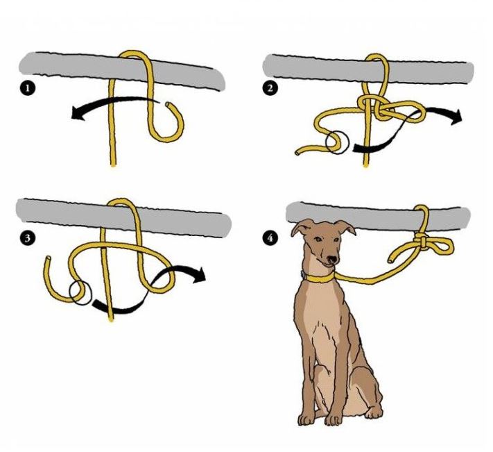 예컨대 산책 중에 개나 고양이를 기둥에 잠깐 묶어놓을 때 유 용하다. U자형 고리를 만들고 반대쪽 매듭 허리를 집어넣을 때 적당한 길이를 유지하는 것이 중요합니다..