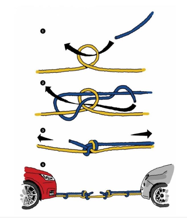 예컨대 스키장에서 눈에 빠진 자동차를 견인해야 하는 경우 견인 장비가 없을 때 유용합니다. 단 한 개의 로프만으로 두 차의 차축을 연결해 효과적인 견인 장치를 만들 수 있다.