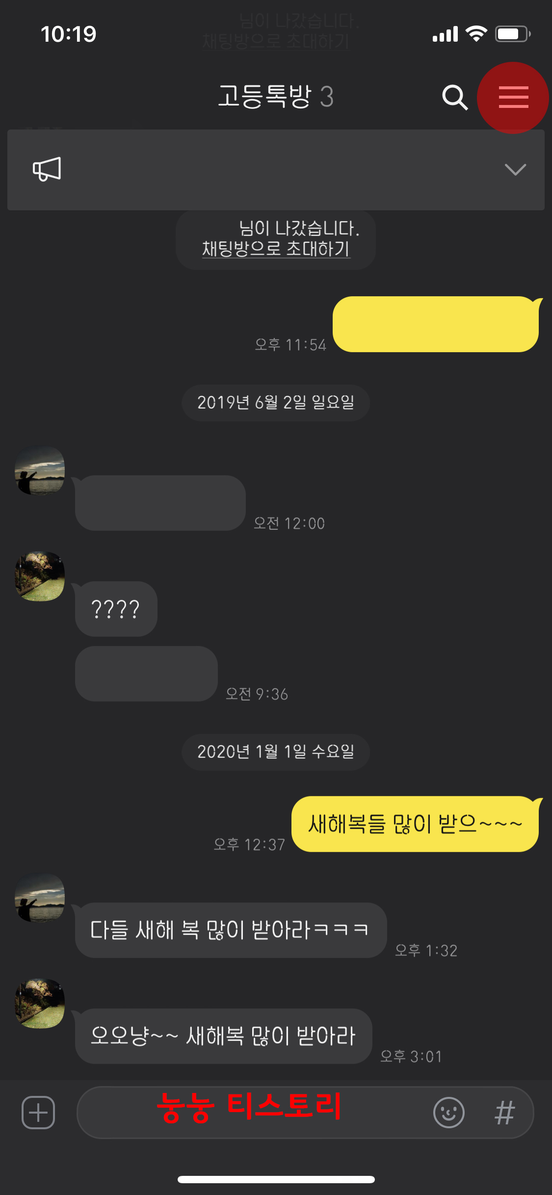1. 일단 톡방에서 우측 상단 메뉴를 눌러줍니다.