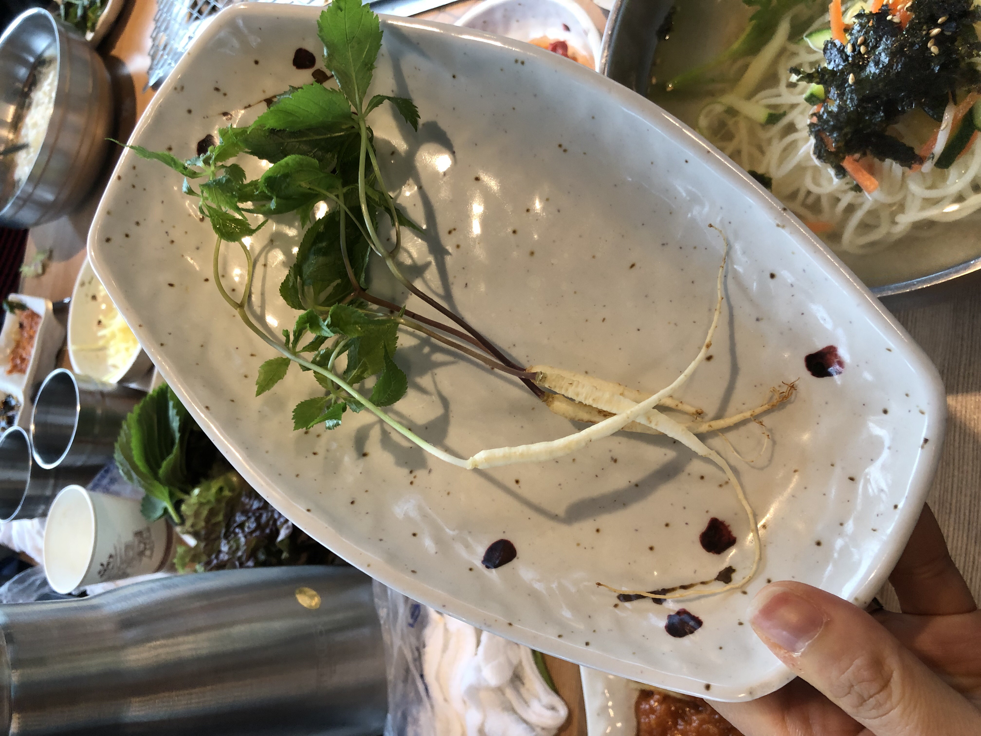 식 후에는 장뇌삼을 서비스로 인당 1개씩 주십니다. 건강에 좋으니 냠냠 먹어주었습니다.