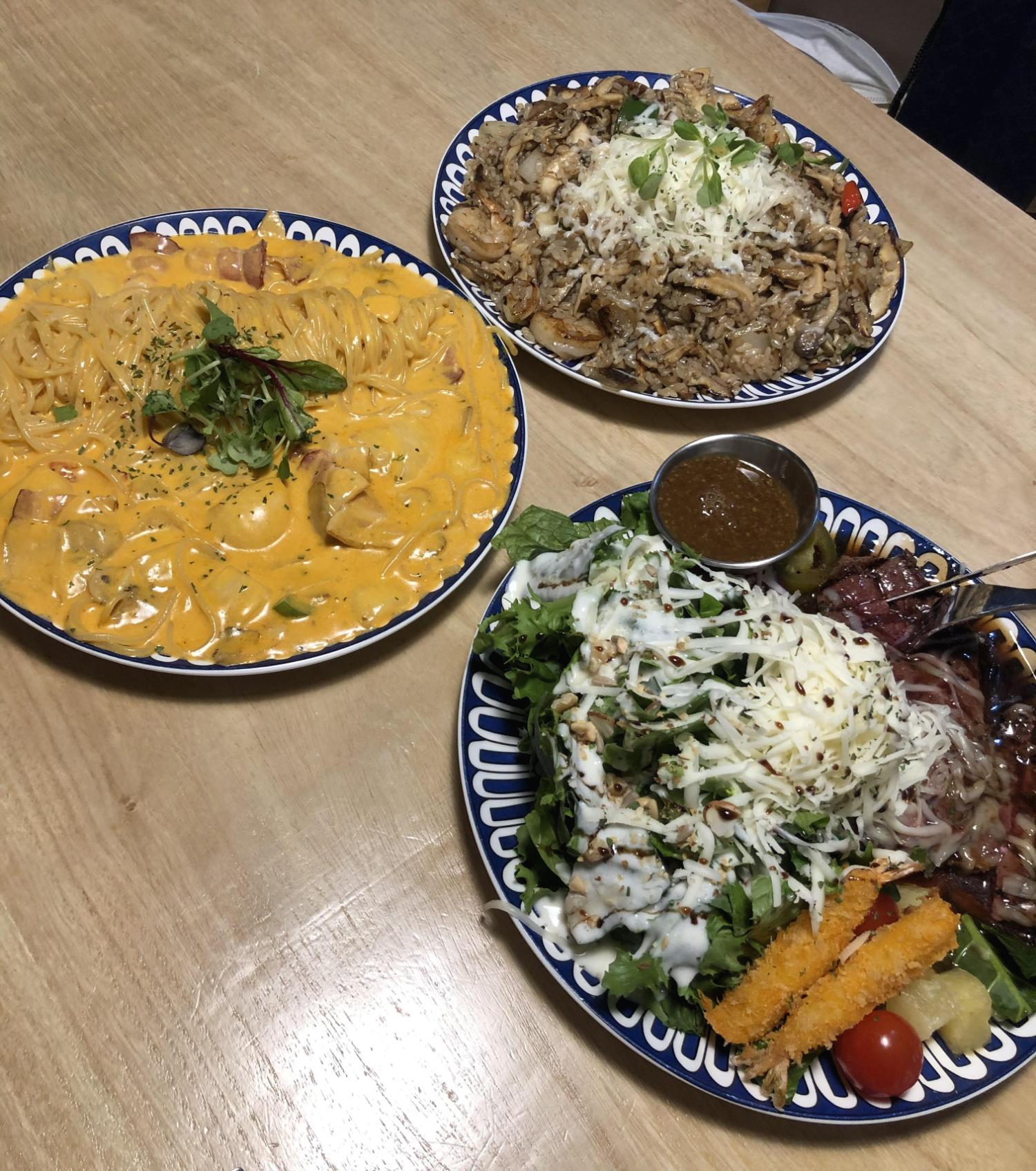 저는 일단 부채살 스테이크, 새우필라프 하프, 오이스터 크림 베이컨 파스타 하프를 주문했습니다.