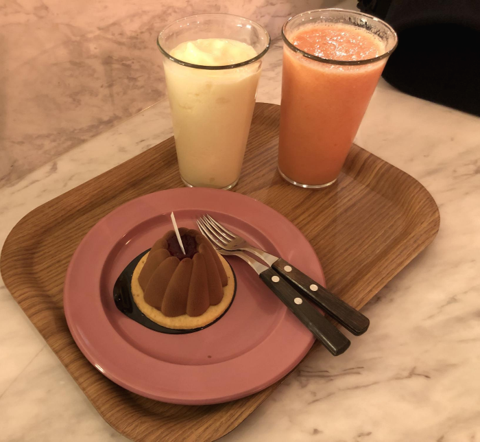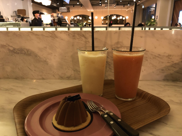 저는 라즈베리 쵸코 케이크를 하나 선택하고 음료 2잔과 함께 결제를 했습니다.