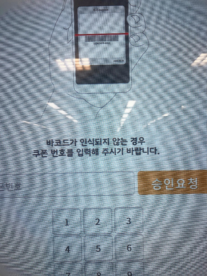 바코드 찍는 곳에 바코드를 찍거나 쿠폰번호였던 휴대폰 번호를 수기로 입력하셔도 됩니다.