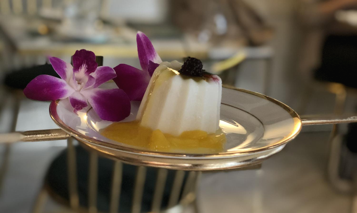 맨위 1단에 있는 디저트는 코코넛 푸딩과 열대과일 소스 입니다.