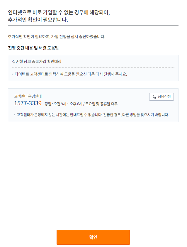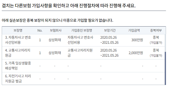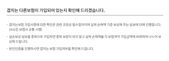 그런데 저 위까지 다 진행하고 다음으로 넘어가는 중 겹치는 다른 보험을 확인해 주더라구요