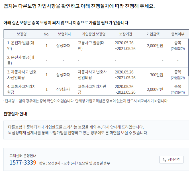 1. 먼저 자동차 보험에 법률지원 특약과 운전자 보험은 동일한 보장을 하는 것이므로, 중복 가입이란 메세가 뜨는 것입니다.