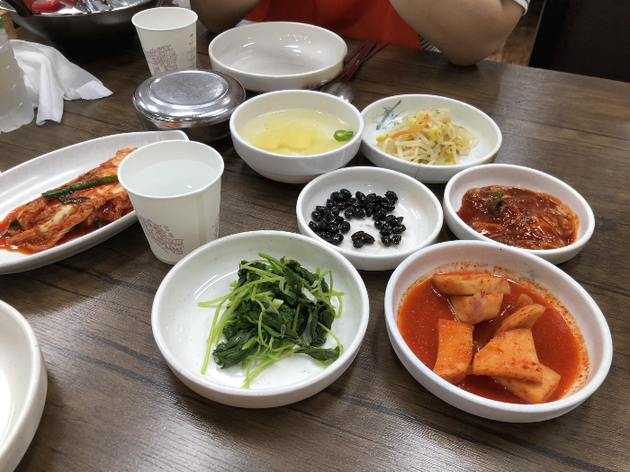 기본반찬이에요~ 깍두기 위에 있는건 어리굴젓 같이 보이더라구요