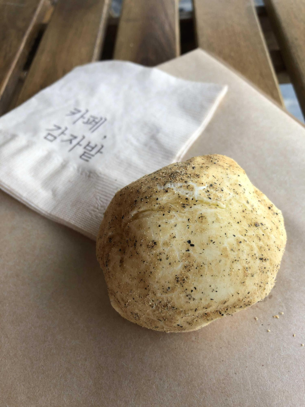슥삭슥삭 잘라보니 겉은 찹쌀빵 같은 쫄깃함이 느껴지고 안쪽은 달달한 감자으깨어서 만든 속이 있어요~