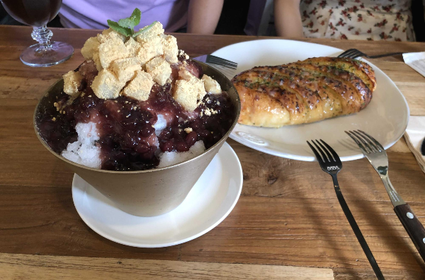 팥빙수와 마늘 빵이 나왔습니다~~