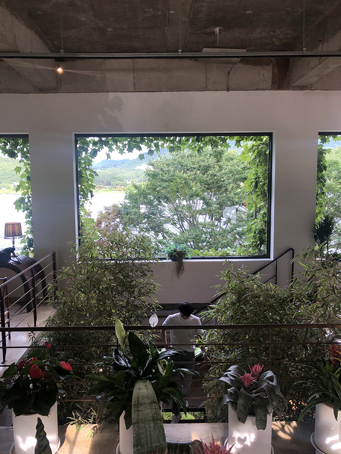 1층 홀도 북한강이 보이는 큼직큼직한 창과 테이블 식물들이 가득 합니다~