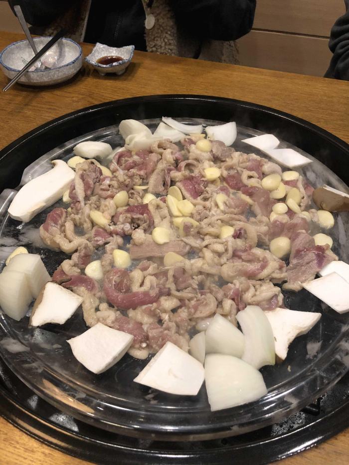 처음엔 오리고기와 마늘 버섯 양파등이 싹 올라가서 지글지글 구워집니다.