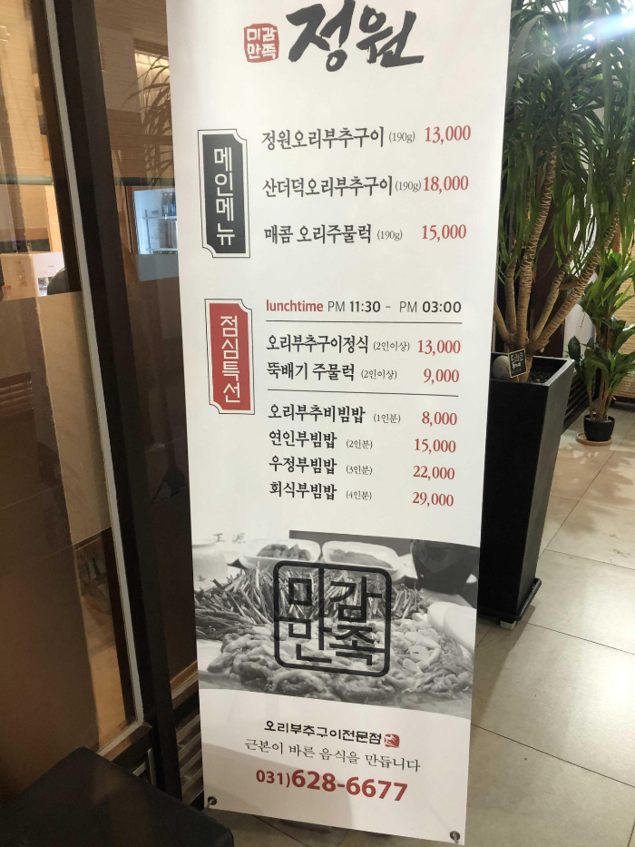 메인 메뉴는 정원오리부추 구이와 산더덕 오리부추 구이 그리고 매콤 오리주물럭이 있네요