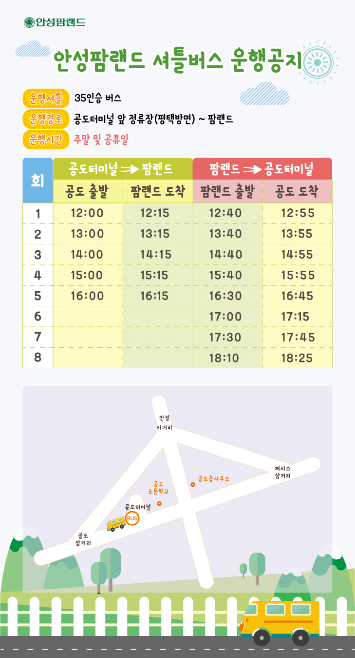 주말 및 공휴일에는 공도 터미널 앞 정류장에서 팜랜드 셔틀버스도 운행 하는군요