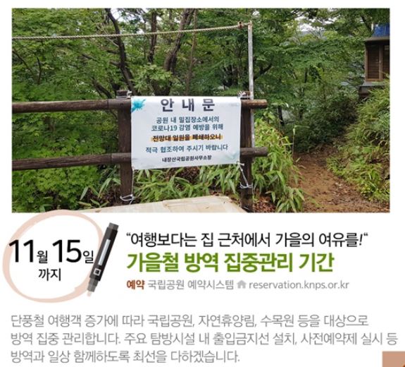 단풍철 여행객 증가에 따라 국립공원, 자연휴양림, 수목원 등을 대상으로 방역 집중 관리합니다. 주요 탐방시설 내 출입금지선 설치, 사전예약제 실시 등 방역과 일상 함께하도록 최선을 다하겠습니다.