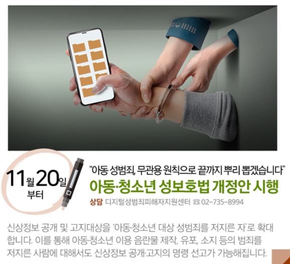 신상정보 공개 및 고지대상을 아동청소년 대상 성범죄를 저지른 자'로 확대 합니다. 이를 통해 아동 청소년 이용 음란물 제작, 유포, 소지 등의 범죄를 저지른 사람에 대해서도 신상정보 공개 고지의 명령 선고가 가능해집니다.