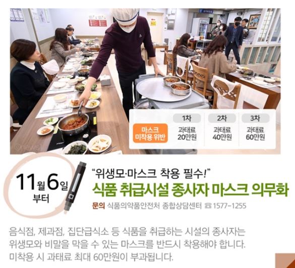 음식점, 제과점, 집단급식소 등 식품을 취급하는 시설의 종사자는 위생모와 비말을 막을 수 있는 마스크를 반드시 착용해야 합니다. 미착용 시 과태료 최대 60만원이 부과됩니다.