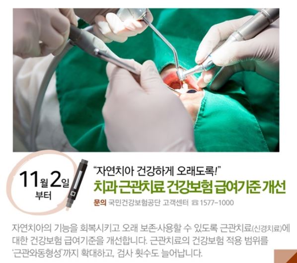 자연치아의 기능을 회복시키고 오래 보존사용할 수 있도록 근관치료(신경치료)에 대한 건강보험 급여기준을 개선합니다. 근관치료의 건강보험 적용 범위를 ‘근관와동형성’까지 확대하고, 검사 횟수도 늘어납니다.