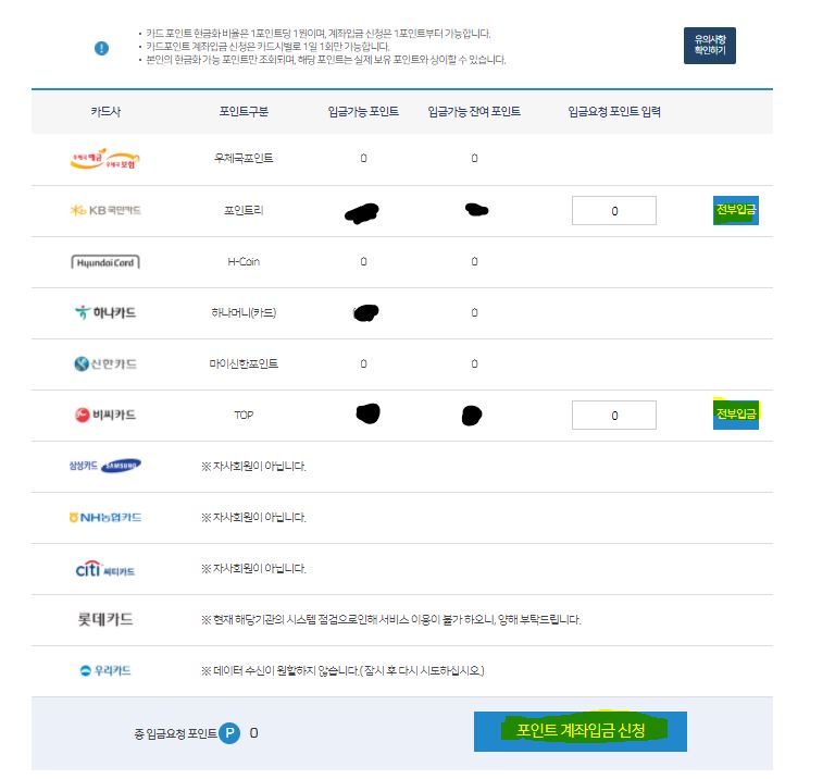 조회될 카드사 명단이 나타나고 왼쪽 버튼은 조회, 우측버튼은 바로 계좌입금 버튼이 나옵니다.