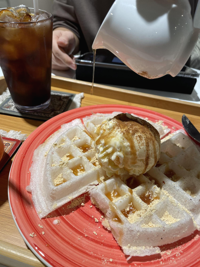 찐 인절미로 만든 인절미 와플! 메이플 시럽과 바닐라 아이스크림과 꿀조합입니다!!