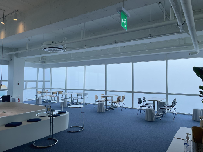 왜냐면 창가에는 이렇게 예쁜 테이블과 큰 창..! 그리고 멋진 (바다와 하늘...)안개 가득한 창이 보입니다~!