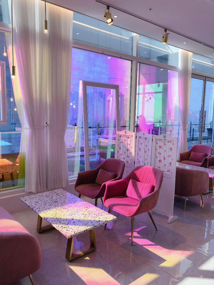 몽환적인 분위기가 넘 매력적이죠 테이블도 금색 메탈과 부드럽고 푸근한 핑크 의자로 포인트를 살려주었군요