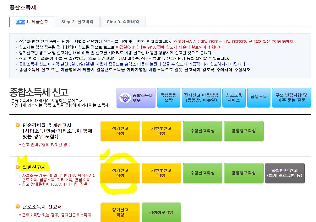 이중에서 일반신고서 탭내에 정기신고작성 항목을 클릭해 줍니다.