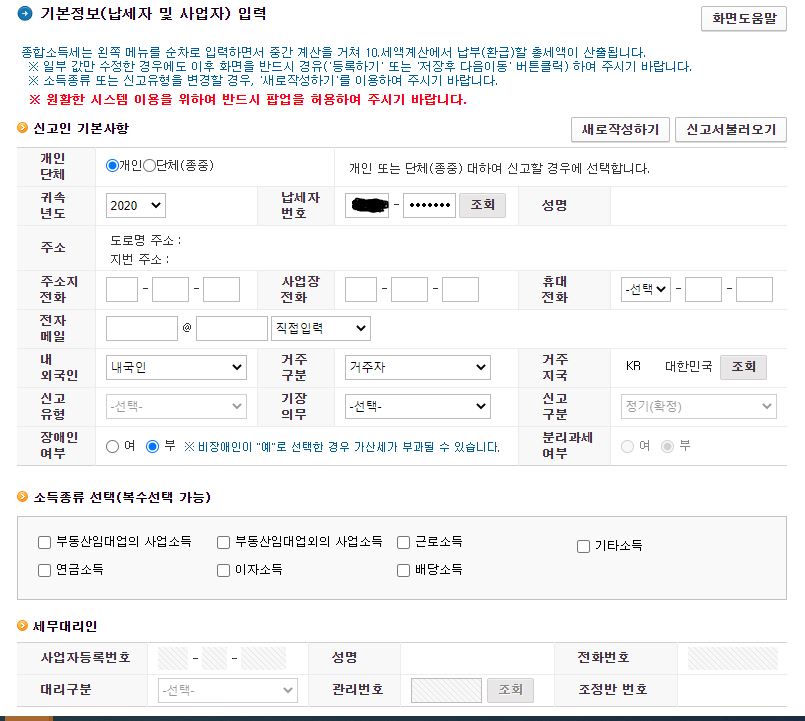 납세자 번호 옆 조회를 선택 하시고 나의 소득종류 찾기를 먼저 하시고 진행하시면 됩니다.