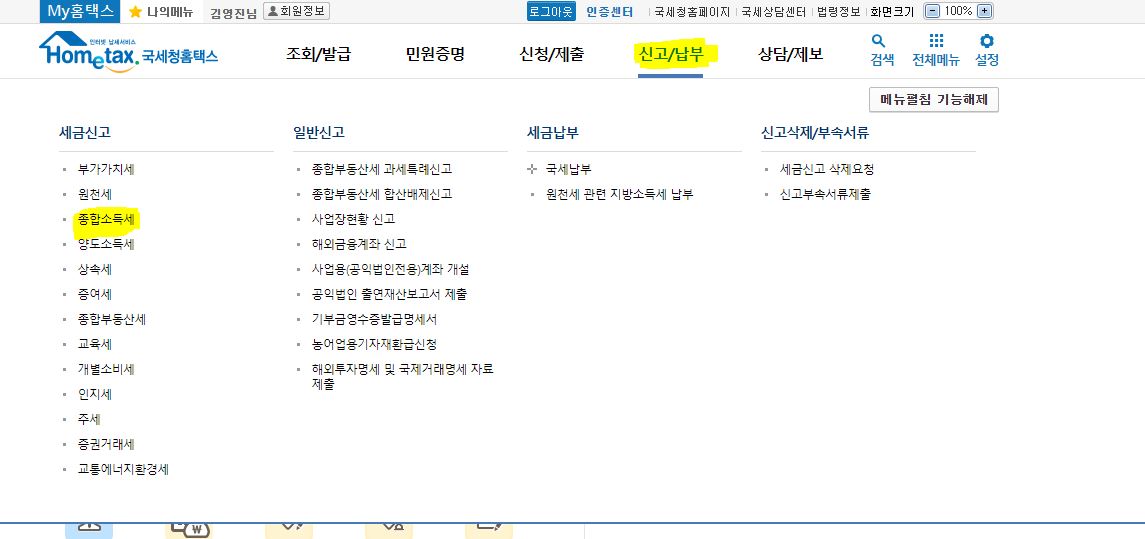 종합소득세 신고 항목을 클릭해서 들어갑니다.
