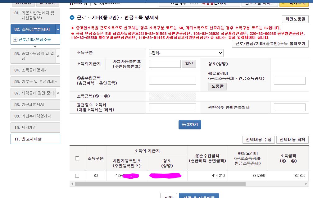 위에 뭔가 어려운 빈공란 탭이 많아서 혼란스러웠지만 소득 불러오기를 하면 하단에 알아서 잘 기입됩니다.