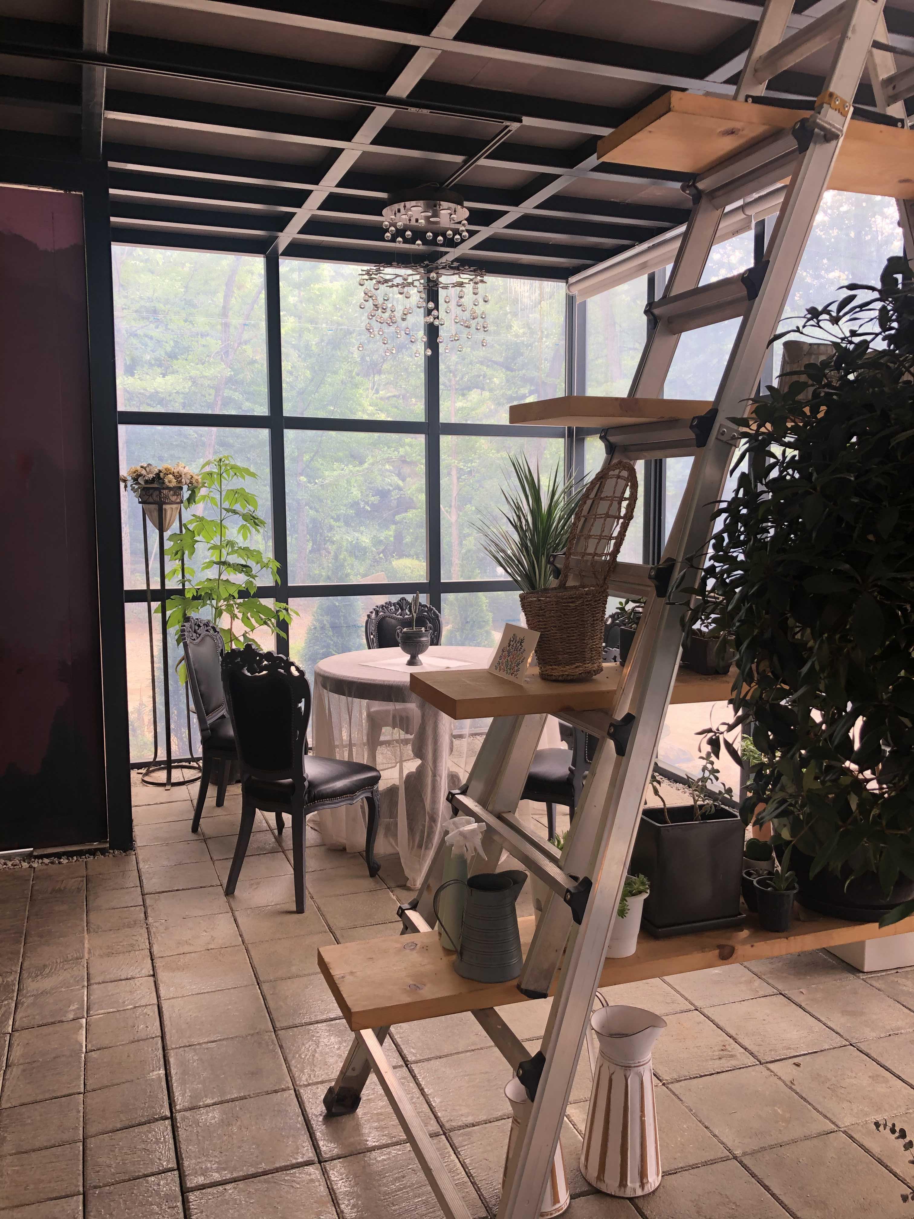 실내 에서 보면 저렇게 밖이 뿌옇게 보이고 약간 엄청 예쁜 카페 느낌 보다는 실내에서 식물 키우는 그런 하우스 느낌이구요 2층도 있었는데 밖이 보이는 몇개 테이블에 다 사람이 있어서