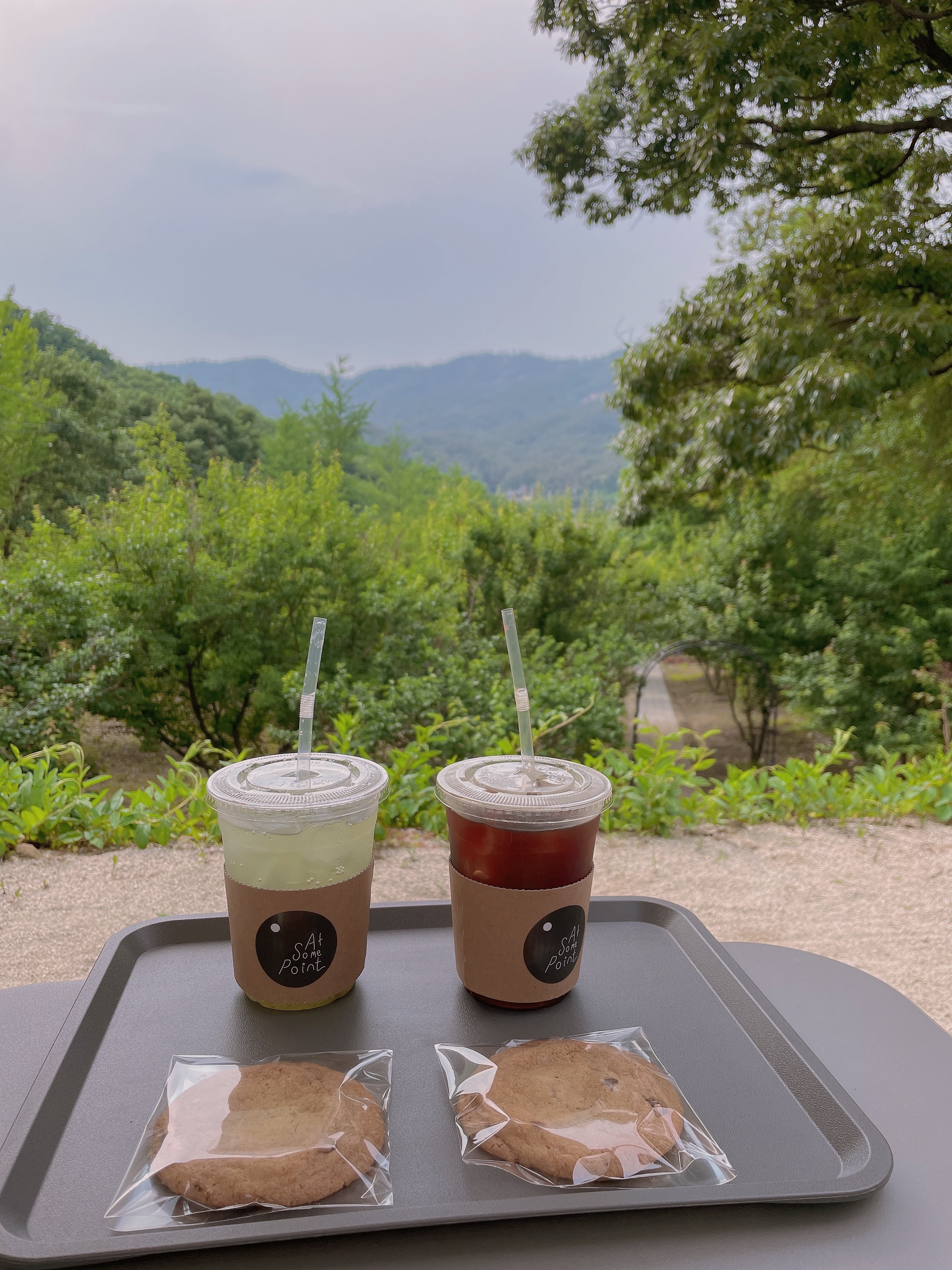 저는 아까 말씀드린 건물 옆 야외 테이블에 앉았는데요 앞이 뻥 뚫려 있고 초록 자연으로 가득 차 있어서 너무 좋았습니다.