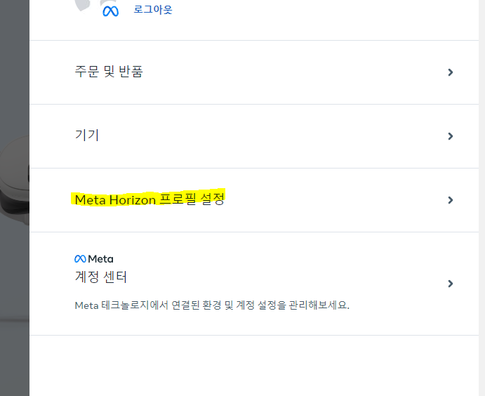 회원가입후 우측 상단 에서 메타호라이즌 프로필 설정을 해줍니다.