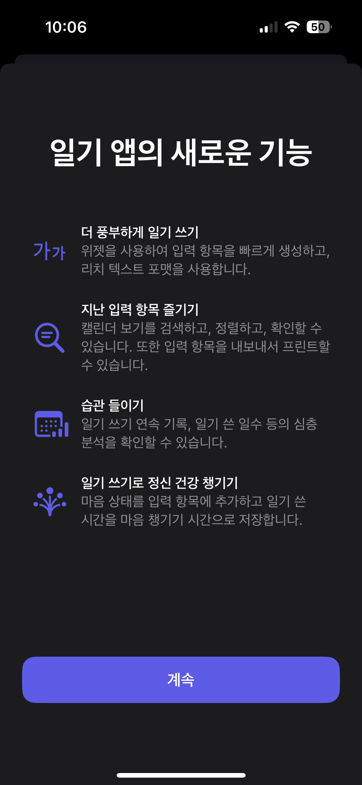 현재 일기 쓰기 연속 기록을 보여주는 위젯이나 일기 쓰기 제안을 하루 내내 바꿔 가며 표시하는 위젯을 홈 화면 및 잠금 화면에 추가하여 매 순간을 성찰할 수 있음
