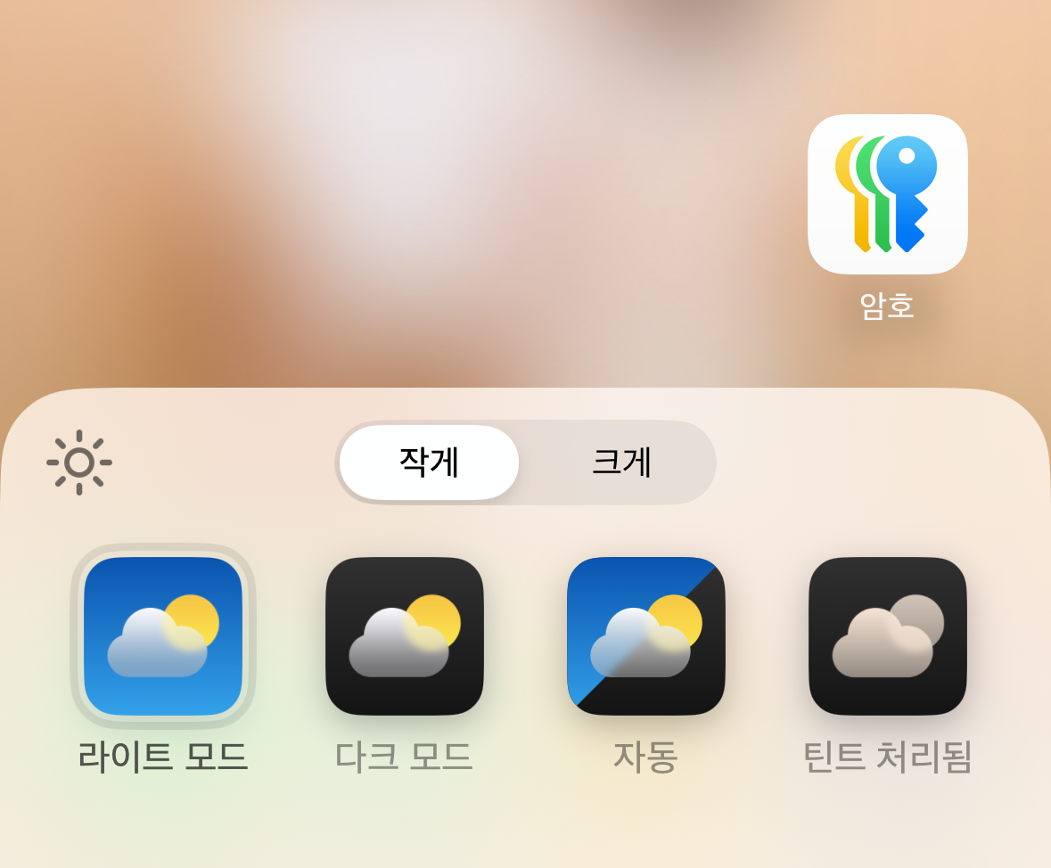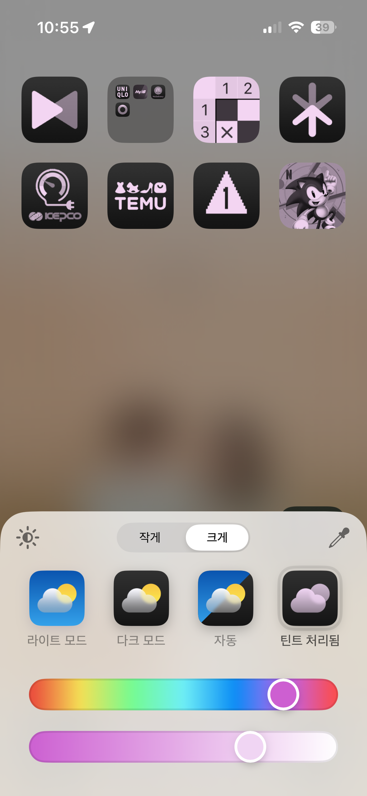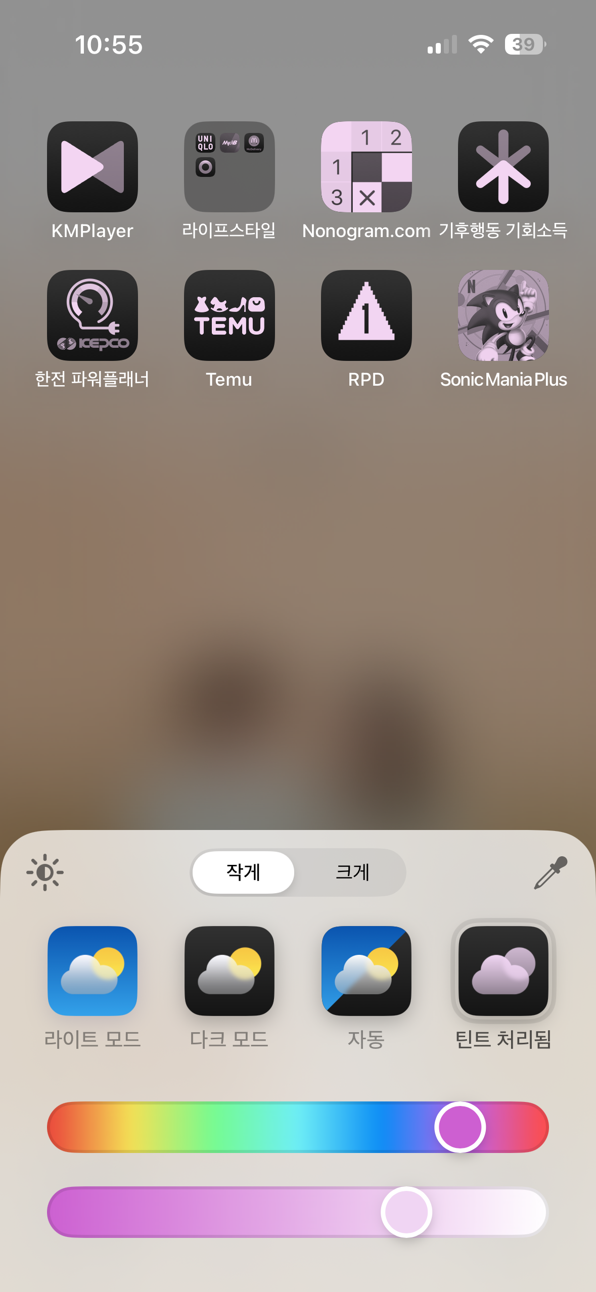 색상 색조를 통해 앱 아이콘 및 위젯에 색상을 적용하거나 iOS로부터 배경화면에 어울리는 색상을 제안받을 수도 있습니다.