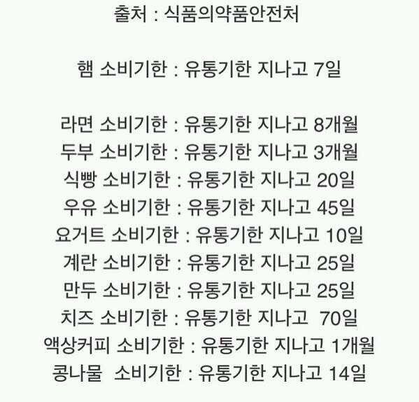 [꿀팁]식품별 소비기한(유통기한 끝난 후에)